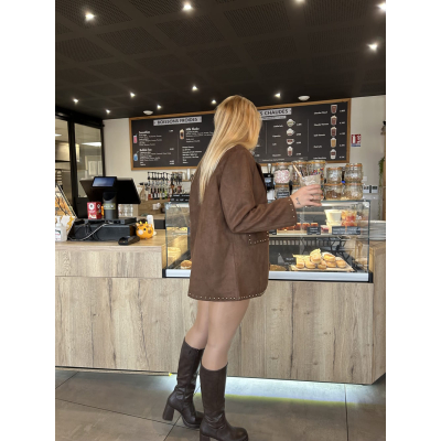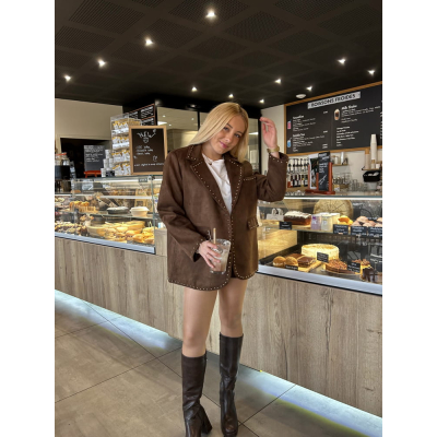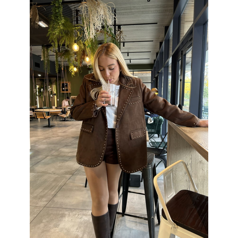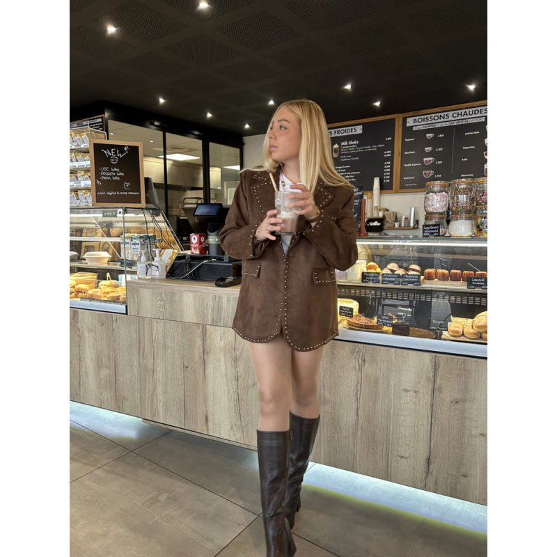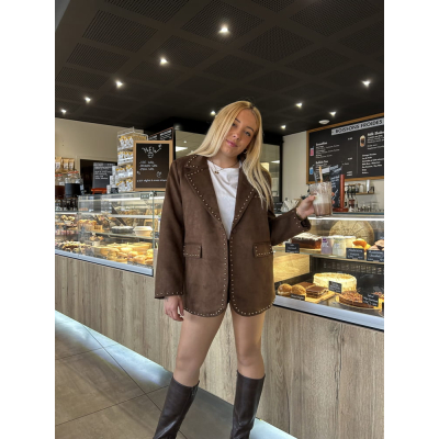 Détail clouté doré sur les revers, les poches et l’ourlet